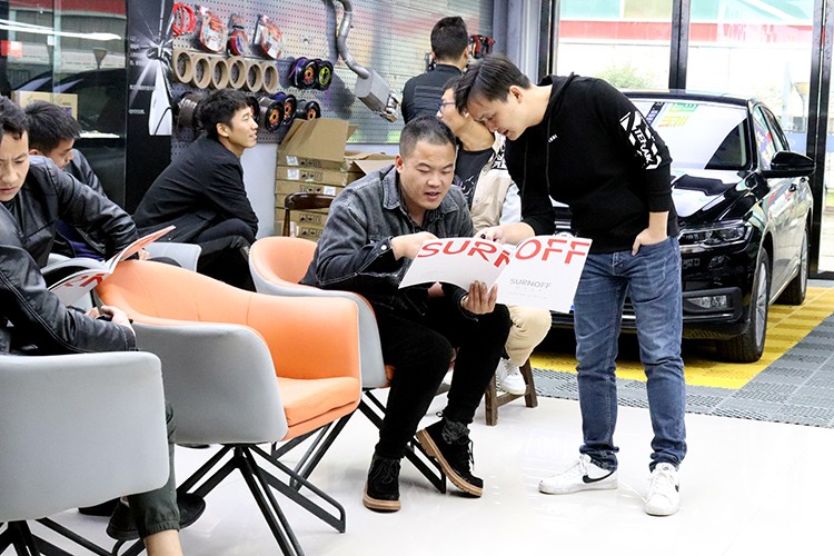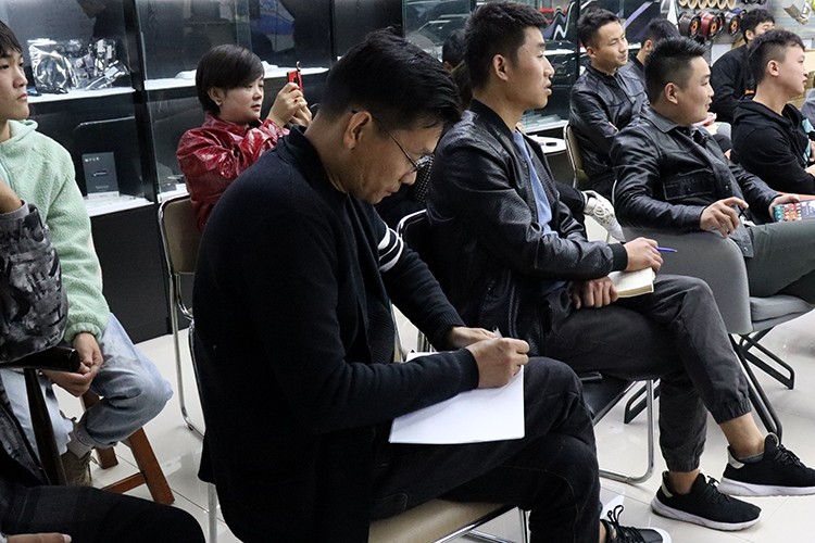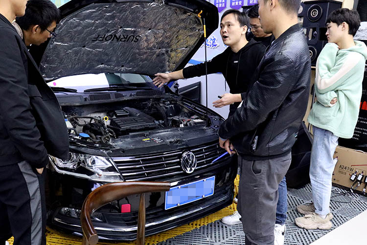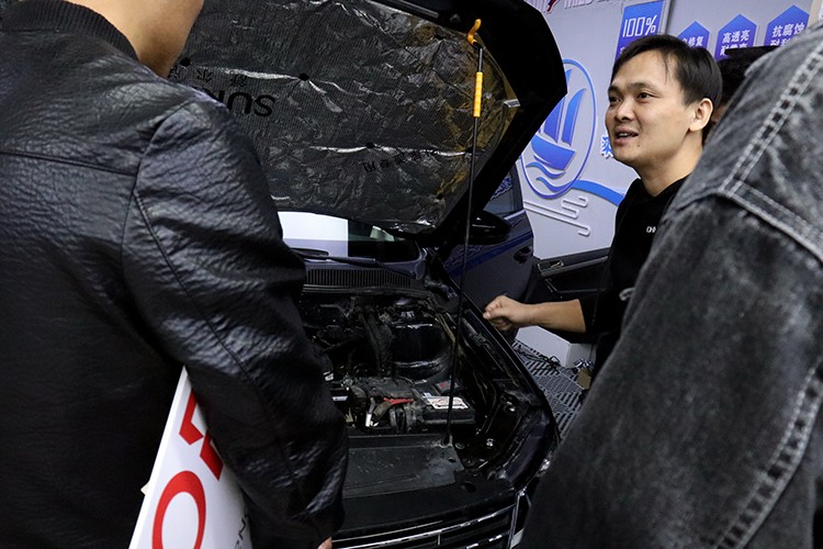 对店家而言,培训贵在可以解决问题,问题解决方案可落地执行,这是店家所期待的。为了详细讲解“发动机噪音主要从哪些部位传到车内这个问题”,高总利用正在改装车间施工的车辆进行讲解,理论结合实践,学员们领会起来很容易。