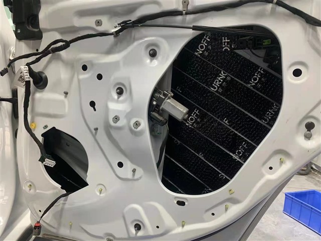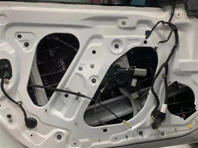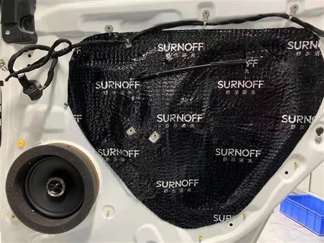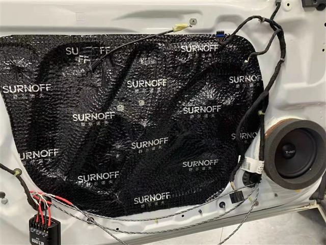 龙川鸿伟改装技师将门板清理干净以后,先使用舒尔诺夫SU200减震胶,对门板做了第一层的止振处理,以降低门板自身共振噪声;然后使用舒尔诺夫SU200减震胶,对门板做第二层密封处理,以阻止风噪传入。改装技师施工手法细腻到位,为保证隔音材料贴合紧密性,改装技师还特意施工专业工具,对隔音材料做了压实处理。