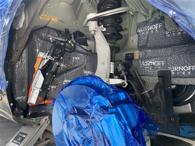 最后在外部的内叶子板位置,针对胎噪噪音的源头,改装技师对此部位使用SU300减震胶+S0450T隔音垫+SR100白棉做三层隔音处理,对轮弧使用SR100白棉做吸音处理,搭配上其他部位的隔音措施,从里到外多层配合发力,将胎噪、路噪隔绝殆尽。