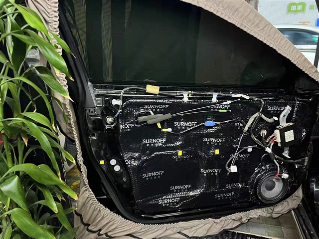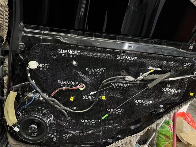 丰田皇冠车的原车门铁皮单薄,密封性也不够完善,选择SU200减震胶做对车门进行双层隔音处理,有效抑制车门共振,减少风噪进入车厢内部。