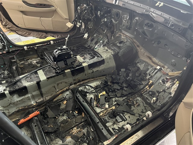 拆下皇冠原车座椅和地毯后,就会发现车底盘上有大大小小的原厂黑色发臭沥青阻尼片,想要彻底除臭,需要将皇冠车内的发臭沥青阻尼片全部铲除清理掉。由于原车沥青阻尼片比较坚固,整个施工耗时也很长,需要预留足够的时间才能完成。